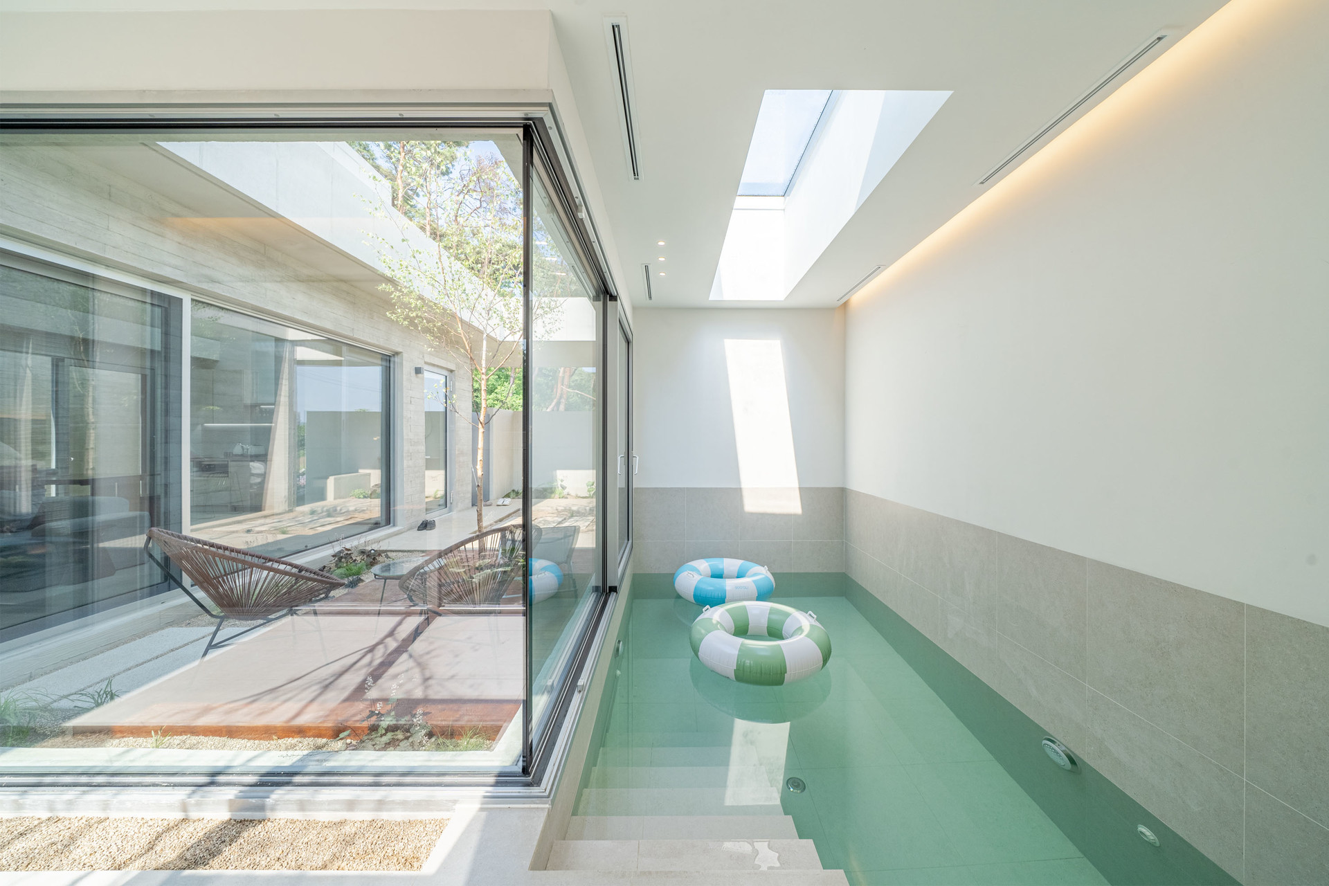 그리고 중정으로의 넓은 창을 통하여 중정과 수영장을 바라볼 수 있게 함으로써
