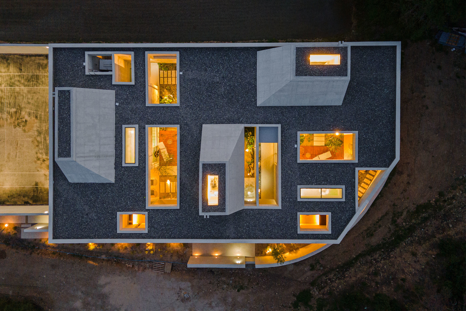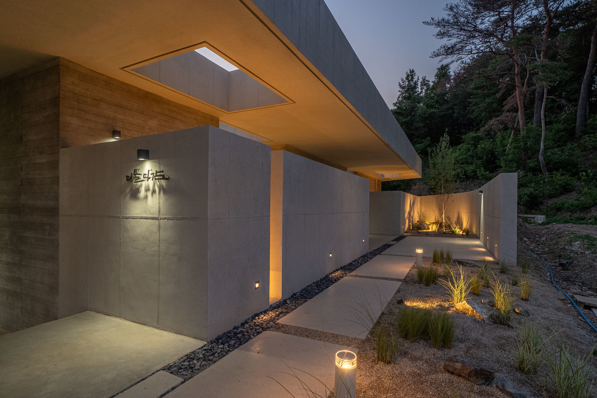 대지의 일부를 절토하여 레벨을 낮추고 주변 또한 일반적으로 사용 하는 저렴한 메시휀스 대신 노출콘크리트로 담장을 만들어